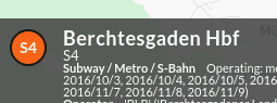Die meisten Fälle sind etwas tiefer verborgen als der oben gezeigte. Wenn solche Fälle erkannt werden, wäre uns mit einer Lookup-Tabelle vom Routennamen (in TRAVIC die kleingedruckte Bezeichnung direkt unter dem Fahrtziel) zum Fahrzeugtyp geholfen. Diese kann uns einfach per Mail zugesandt werden. Die von uns verwendete Fahrzeugtypen entsprechen dem GTFS-Standard und werden hier aufgelistet. Der Fahrzeug-Typ für Züge ist beispielsweise "2".